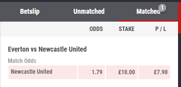 On Smarkets it would look like this on the right-hand side, you can see the stake is the same as the matched amount (£10 in this example):