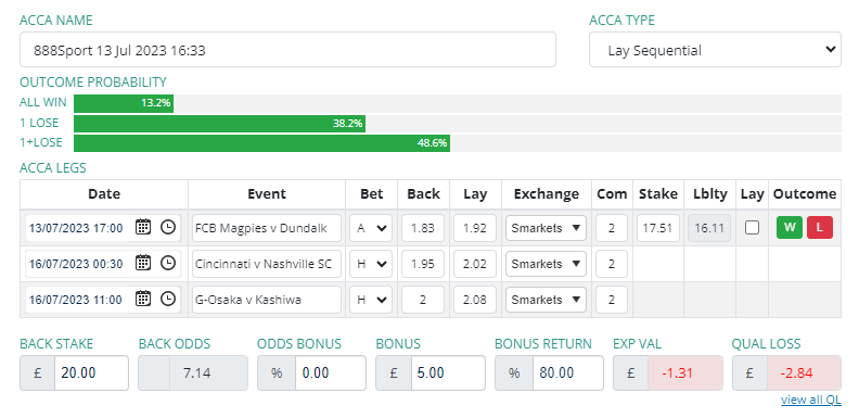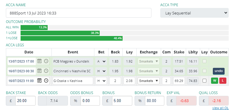 I'll leave this in lay sequential (qualifier) mode for this example, however, if it were a free bet you were using and you changed the acca mode, you would see the expected return (retention) from the free bet in the EV and QL boxes, they will turn positive and change to green, this would now be showing the expected retention of the free bet instead of a qualifying loss, and the lay stakes themselves would be lower as they are being calculated to underlay, the same as SNR mode does for a single bet.