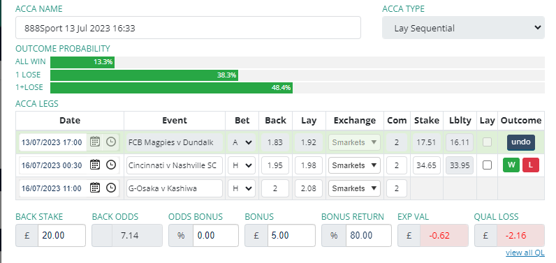 No matter the size of the Acca or the type of offer, it's about choosing the correct calculation method then it's just laying the legs in sequence until the acca is complete or one leg has lost.