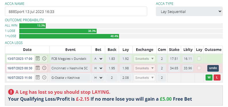Wait for the result of the game, let's assume that Dundalk did win, you then mark the leg "W" as it was your selection that Won, the Acca Finder will then show your next lay stake which you are now due to lay on Cincinnati the Home (H) team you have in the second Leg.