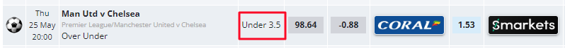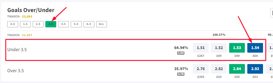 For this bet, you would be looking at the Under 3.5 goals market at Coral and then laying the same at Smarkets. This is how the lay market looks on Smarkets, you need to look for the Goals Over/Under market and then click the box with the number that refers to the bet you need to place. Here you would click the 3.5 box, as we're looking for Under 3.5 goals and click the odds in the blue box to add the lay bet to our bet slip.