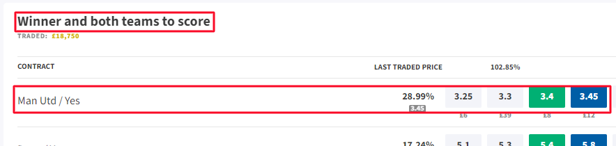 If the match was Man Utd vs Chelsea and you picked Man Utd to win and Both teams to score for your bet, you can lay it with this market.